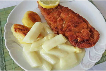 Spargel, Schnitzel und Sauce Hollandaise.