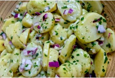 den Kartoffelsalat. Bei mir zu Hause lieben wir ihn! Vor allem gut gewürzt mit einer Vinaigrette und roten Zwiebeln.