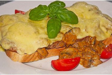 Schweinelende mit Pilzen auf Toast, mit Käse überbacken