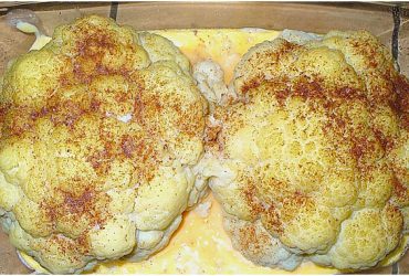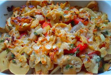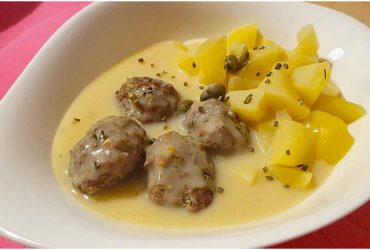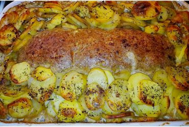 Hackbraten mit Käsefüllung,umgeben von gehobelten Sahne-Kartoffeln