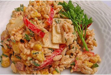 Pikanter Reissalat mit Käse, Salami und Gemüse