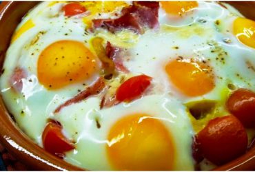 Gebackene Eier mit Hühnerbrust, Zwiebeln und Kirschtomaten