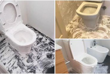 Eine Frau sprüht Rasierschaum auf die Toilettenschüssel, weil sie das so toll findet