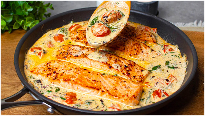 - Den gebratenen Lachs wieder in die Pfanne legen und mit der Sauce und den Tomaten-Spinat-Mischung übergießen. Für weitere 1-2 Minuten köcheln lassen, um den Lachs zu erwärmen und mit Aromen zu durchdringen.