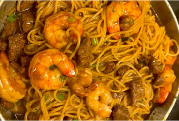 Garnelen mit Rindfleisch und Spaghetti