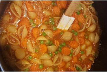 Muschelpasta-Suppe mit Tomaten, Gemüse und Kräutern