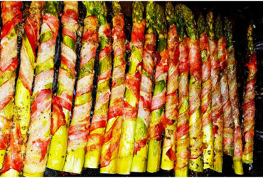 Grüner Spargel mit Speck aus dem Backofen und Zitronen-Knoblauch-Kräuterbutter