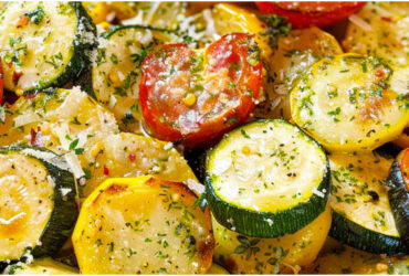 Gebratene Zucchini, Kürbis und Tomaten mit Knoblauch und Parmesan